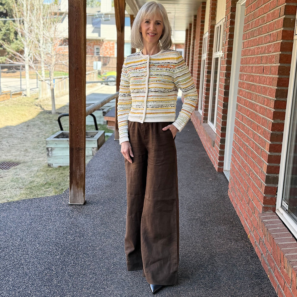 A rich brown colour linen pant paired with a knitted cotton jacket elevates your outfit.