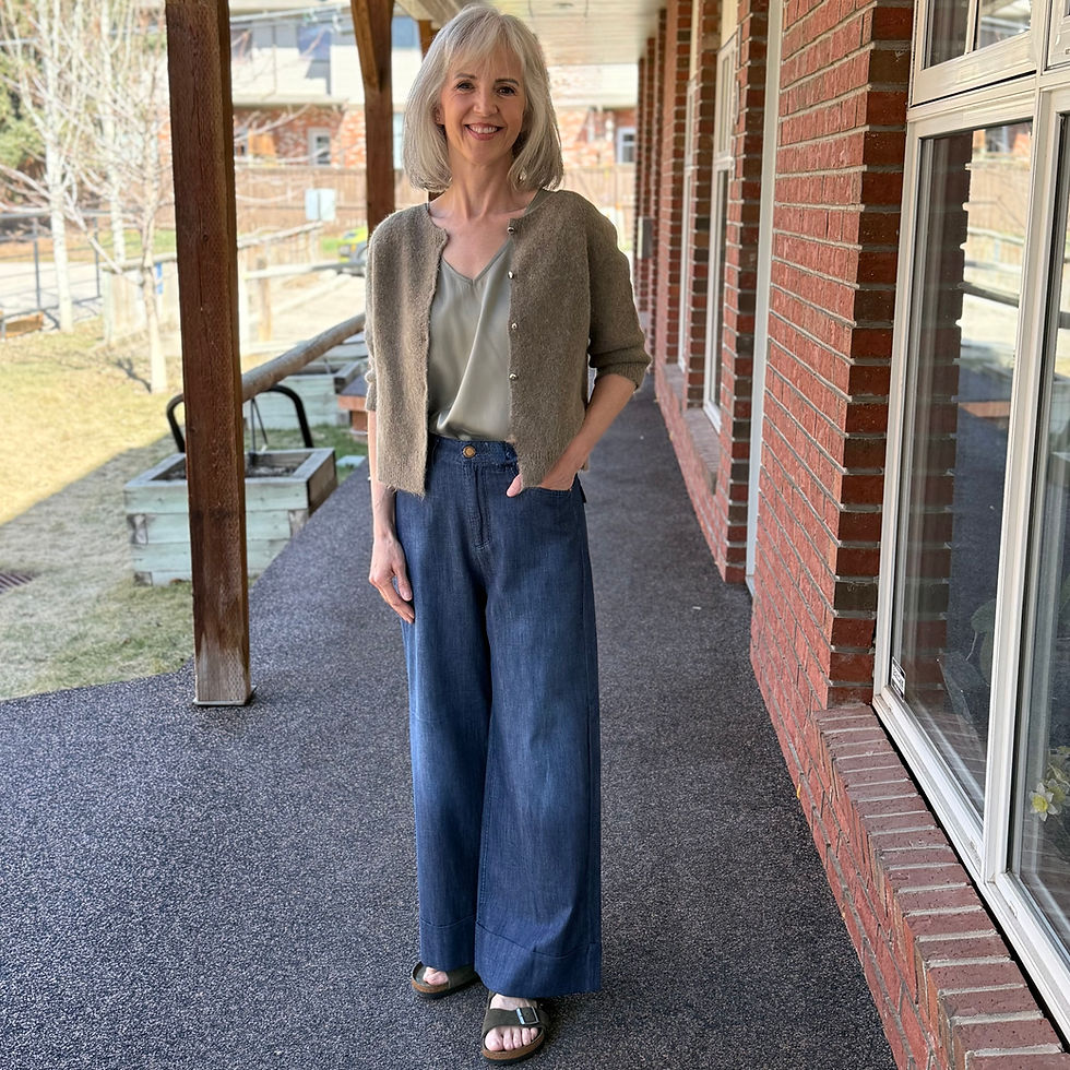 There are many styling options with a short-sleeved knitted cardigan. We think a silky tank top paired with a wide-leg denim pant looks lovely on a beautiful spring day.